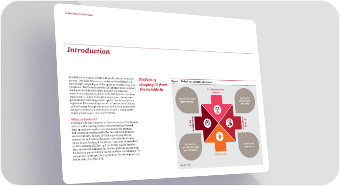 3 PwC Global FinTech Report Introduction It is difficult to imagine a world without the internet or mobile FinTech is Figure 1: FinTech is a comple ecosstem devices. They have become core elements of our lifestyle and shaping FS from have brought a high degree of disruption to virtually every area of business. The financial services (FS) industry is no exception; the outside in C. Infrastructure the digital revolution is transforming the way customers players access financial products and services. Although the sector has experienced a degree of change in recent years, the constant Regulators and Emerging penetration of technology-driven applications in nearly every government technologies segment of FS is something new. At the intersection of finance and tools and technology lies a phenomenon that has been accelerating the pace of change at a remarkable rate and is reshaping the industry’s status quo – it is called FinTech. What is FinTech? comB. T FinTech is a dynamic segment at the intersection of the financial . FS paniesech services and technology sectors where technology-focused A titutions start-ups and new market entrants innovate the products ins and services currently provided by the traditional financial services industry. As such, FinTech is gaining significant momentum and causing disruption to the traditional value chain. In fact, funding of FinTech start-ups more than doubled in 2015 reaching $12.2bn, up from $5.6bn in 2014 based on Investors, the companies included on our DeNovo platform. Cutting-edge incubators and Consumers FinTech companies and new market activities are redrawing the accelerators and users competitive landscape, blurring the lines that define players in the FS sector (see Figure 1). D. Start-ups Source: ‚ƒ