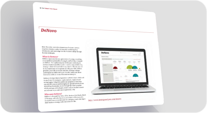 3 PwC Global FinTech Report DeNovo More than ever, innovation impacts your business. DeNovo empowers decision makers by instantly translating data, information and knowledge into the wisdom to adopt the right business strategies. What is DeNovo? DeNovo represents the next generation of strategy consulting – a new platform powered by Strategy& and PwC that is focused on FinTech. The rapid emergence of disruptive technologies and new business models requires a modern way of delivering strategic advice when and where you need it. Whether you are in the board room or on a phone call with your CEO, DeNovo provides you with answers in real-time. Relevant content and insights are delivered to you via web, mobile and direct interaction with our team of innovation strategists. DeNovo’s Subject Matter Specialists in FinTech lead a dedicated team of over 50 strategists, equity analysts, engineers and technologists. Using both public and proprietary data from over 40,000 sources and leveraging our global network of over 200,000 professionals, we cut through the noise to explain which startups, technologies, trends and new market entrants are relevant to you and, more importantly, why. Who uses DeNovo? DeNovo is designed for CEOs, CTOs, Business Unit Heads, Heads of Strategy, and other key decision makers in FS who need a trusted resource to understand the emerging trends that impact http://www.strategyand.pwc.com/denovo their business strategy and what actions to take.