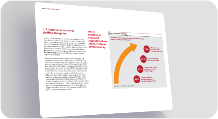 ‰ PwC Global FinTech Report 1.3 Customer centricity is Where Figure €: Šusiness challenges fuelling disruption traditional Financial In which areas do you see the most important impact to your business from FinTech? As clients are becoming accustomed to the digital experience Institutions have offered by companies such as Google, Amazon, Facebook and Apple, they expect the same level of customer experience from failed, FinTechs their financial services providers. FinTech is riding the waves of are succeeding Meet changing disruption with solutions that can better address customer needs 75% customer needs by offering enhanced accessibility, convenience and tailored with new offerings products. In this context, the pursuit of customer centricity has become a main priority and it will help to meet the needs of digital native clientele. 51% Leverage existing Over the next decade, the average FS consumer profile will data and analytics change dramatically as the Baby Boomer generation ages and Generations X and Y assume more significant roles in the global economy. The latter group, also known as “Millennials” (those born between 1980 and 2000), is bringing radical shifts to client Enhance interactions demographics, behaviours and expectations. Its preference for 42% and build trusted a state-of-the-art customer experience, speed and convenience relationships will further accelerate the adoption of FinTech solutions. Millennials seem to be bringing a higher degree of customer centricity to the entire financial system, a shift that is being Enhance business crystallised in the DNA of FinTech companies. While 53% of 42% with sophisticated financial institutions believe that they are fully customer-centric, operational capabilities this share exceeds 80% for FinTech respondents. In this respect, 75% of our respondents confirmed that the most important impact FinTech will have on their businesses is an increased Source: ‚ƒ …oa FinTech Sur€ey 21† focus on the customer (see Figure 5).
