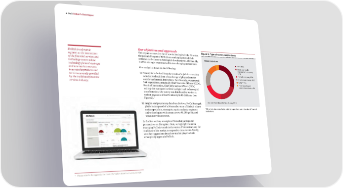 PwC Global FinTech Report Our objectives and approach Figure 2 Tpe o sure respon ents FinTech is a dynamic This report assesses the rise of new technologies in the FS sector, segment at the intersection the potential impact of FinTech on market players and their of the financial services and attitudes to the latest technological developments. Additionally, Global brea own technology sectors where it offers strategic responses to this ever-changing environment. n ‡anˆ 3‰ technology-focused start-ups Our analysis is based on the following: n Asset and ƒeath and new market entrants management company innovate the products and 21‰ services currently provided 1) Primary data derived from the results of a global survey that n FinTech company 2‰ by the traditional financial includes feedback from a broad range of players from the n Insurance company 14‰ services industry. world’s top financial institutions. For this study, we surveyed n therŠ 11‰ 544 respondents, principally Chief Executive Officers (CEOs), n Fund transfer and Heads of Innovation, Chief Information Officers (CIOs) payments institution 4‰ and top-tier managers involved in digital and technological transformation. Our survey was distributed to leaders in various segments of the FS industry in 46 countries (see 1 Figure 2). 2) Insights and proprietary data from DeNovo, PwC’s Strategy& Source: ‚ƒ …oa FinTech Sur€ey 21† platform composed of a 50-member team of FinTech subject matter specialists, strategists, equity analysts, engineers Šther incudes consutants‹ nationa super€isory and internationa financia and technologists with access to over 40,000 public and institutions„ proprietary data sources. In the first section, we explore FS market participants’ perspectives on disruption. Next, we highlight the main emerging FinTech trends in the various FS industries and the readiness of the market to respond to these trends. Finally, we offer suggestions about how market players should strategically approach FinTech. 1 ‚ease refer to the appendi for more information aout our sur€ey sampe„