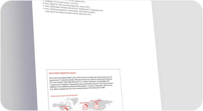 End notes 1 PwC, 18th Annual Global CEO Survey, January 2015. 2 Strategy&, 2015 Growth Survey, June 2015. 3 PwC, Digital IQ: Three surprising digital bets, January 2015. 4 PwC, Global Data & Analytics Survey 2014: Big Decisions™, September 2014. 5 PwC, Achieving excellence—Cybermetrics: what directors need to know (Audit Committee Excellence Series), September 2015. About PwC’s Digital IQ research We’ve been conducting Digital IQ since 2007 and this year marks our seventh annual survey of business and IT executives globally. This year’s survey was conducted July through September 2015 and included 1,988 respondents from 51 countries. Responses were aggregated into 7 regions and 10 industries. Respondents were evenly divided between IT and business leaders. Reflective of the distribution of respondents globally, 21% work in organizations with revenues of $1 billion or greater and 52% have revenues between $500 million and $1 billion. Global survey respondent breakdown Central and Eastern Western Europe Europe North America 24% 7% 29% Middle East Asia and Africa 4% 22% Latin America 14% ® 2015 Global Digital IQ Survey 23