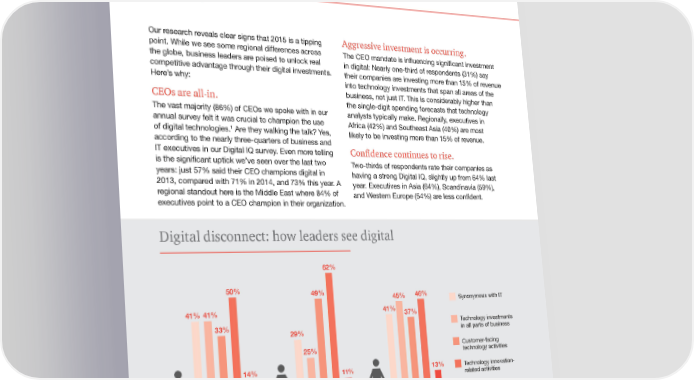 What do the digital signs reveal about your business? Our research reveals clear signs that 2015 is a tipping Aggressive investment is occurring. point. While we see some regional differences across The CEO mandate is influencing significant investment the globe, business leaders are poised to unlock real in digital: Nearly one-third of respondents (31%) say competitive advantage through their digital investments. their companies are investing more than 15% of revenue Here’s why: into technology investments that span all areas of the CEOs are all-in. business, not just IT. This is considerably higher than The vast majority (86%) of CEOs we spoke with in our the single-digit spending forecasts that technology annual survey felt it was crucial to champion the use analysts typically make. Regionally, executives in Africa (42%) and Southeast Asia (40%) are most 1 of digital technologies. Are they walking the talk? Yes, likely to be investing more than 15% of revenue. according to the nearly three-quarters of business and IT executives in our Digital IQ survey. Even more telling Confidence continues to rise. is the significant uptick we’ve seen over the last two Two-thirds of respondents rate their companies as years: just 57% said their CEO champions digital in having a strong Digital IQ, slightly up from 64% last 2013, compared with 71% in 2014, and 73% this year. A year. Executives in Asia (64%), Scandinavia (59%), regional standout here is the Middle East where 84% of and Western Europe (54%) are less confident. executives point to a CEO champion in their organization. Digital disconnect: how leaders see digital 62% 50% 49% 45% 46% Synonymous with IT 41% 41% 41% 37% 33% Technology investments 29% in all parts of business 25% Customer-facing technology activities 14% 11% 13% Technology innovation- related activities Data and analytics activities CIO CMO CDO ® Source: PwC, 2015 Global Digital IQ Survey; Base: 1,988 Q: How does your organization define digital? Select up to two statements that best describe your company. ® 2015 Global Digital IQ Survey 4