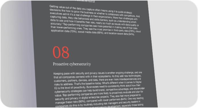 07 Effective use of business data Getting value out of the data you capture often means using it to guide strategic decisions like how to grow the business or whether to collaborate with competitors. And executives admit it’s a real challenge in their organizations. More than challenges with capturing data, they cite behavioral and skills barriers, such as understanding which data to use and how it benefits their role, nearly as much as issues with data quality or 4 accuracy. Top-performing companies see more potential in making use of their data than lower-performing ones. They see the most promise in third-party data (78%), cloud application data (70%), social media data (69%), and location-aware data (64%). 08 Proactive cybersecurity Keeping pace with security and privacy issues is another ongoing challenge, and one that all companies contend with in their ecosystems. As they add new technologies, customers, partners, devices, and data, there are ever more interdependencies and risks to address. That’s the baseline today. What’s different when it comes to Digital IQ is the level of proactivity. Businesses need to consistently think about how their cybersecurity strategies can help build brand, competitive advantage, and shareholder value. Top-performing companies are more likely to proactively evaluate and plan for security and privacy in digital enterprise projects. They also feel more prepared to manage these risks (80%), compared with lower performers (64%). One way leading companies do this is by routinely including risk managers and security leaders in conversations about new product and service development, especially those taking advantage of emerging technologies like the Internet of Things. ® 2015 Global Digital IQ Survey 19