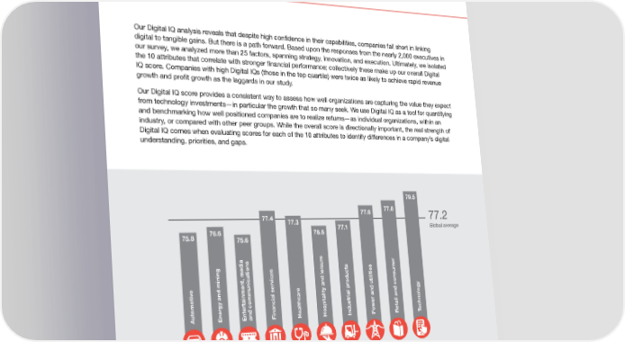 What’s your Digital IQ? Our Digital IQ analysis reveals that despite high confidence in their capabilities, companies fall short in linking digital to tangible gains. But there is a path forward. Based upon the responses from the nearly 2,000 executives in our survey, we analyzed more than 25 factors, spanning strategy, innovation, and execution. Ultimately, we isolated the 10 attributes that correlate with stronger financial performance; collectively these make up our overall Digital IQ score. Companies with high Digital IQs (those in the top quartile) were twice as likely to achieve rapid revenue growth and profit growth as the laggards in our study. Our Digital IQ score provides a consistent way to assess how well organizations are capturing the value they expect from technology investments—in particular the growth that so many seek. We use Digital IQ as a tool for quantifying and benchmarking how well positioned companies are to realize returns—as individual organizations, within an industry, or compared with other peer groups. While the overall score is directionally important, the real strength of Digital IQ comes when evaluating scores for each of the 10 attributes to identify differences in a company’s digital understanding, priorities, and gaps. 79.5 77.6 77.8 77.2 77.4 77.3 76.6 76.6 77.1 Global average 75.8 75.6 e e oducts gy and mining communications echnology Automotive Ener Entertainment, media and Financial servicesHealthcarHospitality and leisurIndustrial prPower and utilities Retail and consumer T ® Source: PwC, 2015 Global Digital IQ Survey; Base: 1,988 ® 2015 Global Digital IQ Survey 10
