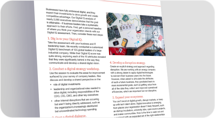 Next steps for raising your Digital IQ Businesses have fully embraced digital, and they expect their investments to drive growth and create competitive advantage. Our Digital IQ analysis of nearly 2,000 executives demonstrates that the goal is attainable—if business leaders take a systematic approach to their efforts. First, get a personal baseline of where you think your organization stands with our Digital IQ assessment. Then, consider these next steps: 1. Dig in to your Digital IQ. Take the assessment with your business and IT leadership team. We recently conducted a customized Digital IQ benchmark of 125 global leaders of a large industrial company. While their Digital IQ score was quite strong, exploring each of the 10 attributes revealed that they were significantly behind in the way they 4. Develop a disruption strategy. communicate and develop a shared digital vision. 2. Conduct a digital strategy workshop. Create an explicit strategy and approach regarding disruption. We are working with an energy company Use the session to evaluate the areas for improvement with a strong desire to apply digital technologies surfaced by your survey of company leaders. Also to reinvent their business years into the future. discuss and develop a shared perspective on the: However, when asked to articulate the attributes § role of digital investments of such a future business, they gravitated back to § leadership and organizational roles needed to more incremental goals, such as getting value from drive digital, including responsibilities of the all of the data they collect and improved operational CDO, CIO, CMO, and other key executives efficiencies, which are important but not disruptive. § other internal disruptions that are occurring 5. Expand your ecosystems. but aren’t being directly addressed, such as You can’t excel at digital growth, disrupt markets, or keep the organization’s increasingly distributed up with tech talent alone. Digital innovation is emerging but uncoordinated technology spending from places your organization doesn’t likely frequent, such 3. Start a digital dialogue. as startup incubators, university labs, open source projects, and maker communities. Now is the time to seek out and Consider an enterprise-wide Digital IQ benchmark experiment with an expanded set of the right relationships to serve as a way to begin engaging around digital to keep your ideas and skills fresh and flowing. strategy with the full organization. Also think about Find out your company’s Digital IQ how to use technology—video, internal social media, at www.pwc.com/digitaliq and mobile—to continue the digital conversation. ® 2015 Global Digital IQ Survey 22