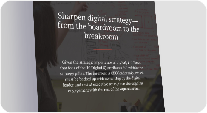 Sharpen digital strategy— from the boardroom to the breakroom Given the strategic importance of digital, it follows that four of the 10 Digital IQ attributes fall within the strategy pillar. The foremost is CEO leadership, which must be backed up with ownership by the digital leader and rest of executive team, then the ongoing engagement with the rest of the organization. ® 2015 Global Digital IQ Survey 11