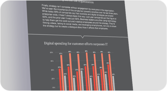 04 Strategy-sharing across the organization Finally, strategy isn’t complete without engagement by everyone in the organization. We’ve seen the importance of this simple but powerful practice over the last three years. While today 69% of companies say that business and digital strategies are shared enterprise-wide, it hasn’t always been this way. Last year companies put that figure at 55%, and the prior year it was just 50%. Business leaders are often using technology to help them get the word out and mobilize employees around the strategy. They’re filming videos, taking to social media, and leveraging smartphones, not only to share the strategy but to create a dialogue about how it affects their employees. Digital spending for customer efforts surpasses IT 50% 49% 48% 50% 48% 49% 48% 47% 40% 33% 33% 33% 35% 31% 29% 30% 27% 28% 23% 23% 20% 19% 21% 20% 20% 10% 0% Africa Asia Central and Latin Middle North Western Eastern America East America Europe Europe IT Marketing and sales Other functions ® Source: PwC, 2015 Global Digital IQ Survey; Base: 1,988 Q: In the last 12 months, what percentage of your organization’s digital enterprise budget was spent in the following areas? Cateogry mean. ® 2015 Global Digital IQ Survey 14