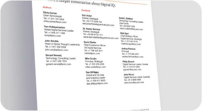www.pwc.com/digitalIQ To have a deeper conversation about Digital IQ: Authors Contacts Chris Curran Olaf Acker David L Edelheit Chief Technologist Partner, Strategy& Technology Consulting Leader, Tel: +1 214 754 5055 Tel: +49 170 2238 453 Asia Pacific [email protected] [email protected] Tel: +65 6236 4008 Tom Puthiyamadam Dr. Rainer Bernnat [email protected] Global Digital Services Leader Partner, Strategy& Matt Egol Tel: +1 646 471 1490 Tel: +49 69 97167 414 Chief Strategy Officer, [email protected] [email protected] Digital Services, Strategy& John Sviokla David Clarke Tel: +1 212 551 6716 Head of Global Thought Leadership Chief Experience Officer, [email protected] Tel: +1 617 530 5359 US Digital Services Andrea Fishman [email protected] Tel: +1 786 552 3211 Principal Gerard Verweij [email protected] Tel: +1 773 598 4401 Technology Consulting Leader Mike Cooke [email protected] Tel: +1 617 530 7015 Principal, Strategy& Philip Grosch [email protected] Tel: +1 312 578 4639 Digital Services Leader, Canada [email protected] Tel: +1 416 814 5855 Dan DiFilippo [email protected] Global and US Data John Riccio and Analytics Leader Digital Services Leader, Australia Tel: +1 646 471 8426 Tel: +61 3 8603 4968 [email protected] [email protected] © 2015 PwC. All rights reserved. PwC refers to the PwC network and/or one or more of its member firms, each of which is a separate legal entity. Please see www.pwc.com/structure for further details. Digital IQ® is a trademark of PricewaterhouseCoopers LLP US. PwC helps organisations and individuals create the value they’re looking for. We’re a network of firms in 157 countries with more than 195,000 people who are committed to delivering quality in assurance, tax and advisory services. Find out more and tell us what matters to you by visiting us at www.pwc.com. PricewaterhouseCoopers has exercised reasonable care in the collecting, processing, and reporting of this information but has not independently verified, validated, or audited the data to verify the accuracy or completeness of the information. PricewaterhouseCoopers gives no express or implied warranties, including but not limited to any warranties of merchantability or fitness for a particular purpose or use and shall not be liable to any entity or person using this document, or have any liability with respect to this document. This report is for general purposes only, and is not a substitute for consultation with professional advisors. 78677-2016 LL